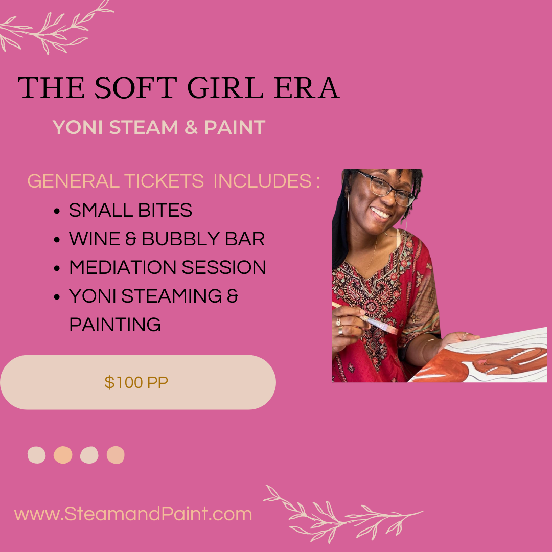 Often times, we are unaware that we are tough, hard, heavy and rightful so. Our past carries trauma, let downs and things that may have been out of our controls. It’s time. to tap into your Soft Girl Era whatever that may means for you. This Event was created to remind you its okay not be strong. Come out and connect with other women Through Yoni Steaming and Painting.